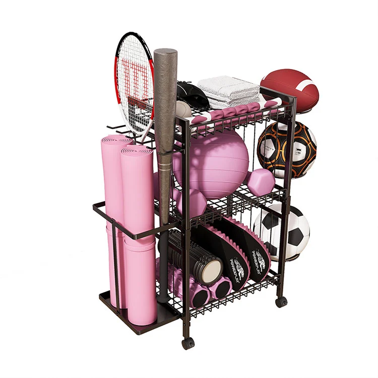 Αυτή η επιδαπέδια σχάρα αποθήκευσης μεταλλικού χαλιού γιόγκα έχει τρία στρώματα συν δύο πλαϊνά συστήματα αποθήκευσης. Η αριστερή πλευρά είναι ανεξάρτητα σχεδιασμένη, διευρύνοντας τον χώρο, ο οποίος μπορεί να χωρέσει 2-3 χαλάκια γιόγκα κανονικού μεγέθους όταν τοποθετηθούν σε όρθια θέση. Η όρθια αποθήκευση μπορεί επίσης να φιλοξενήσει εξοπλισμό μεγάλου μήκους όπως ρακέτες τένις, μπαστούνια του μπέιζμπολ, μπαστούνια χόκεϊ κ.λπ.